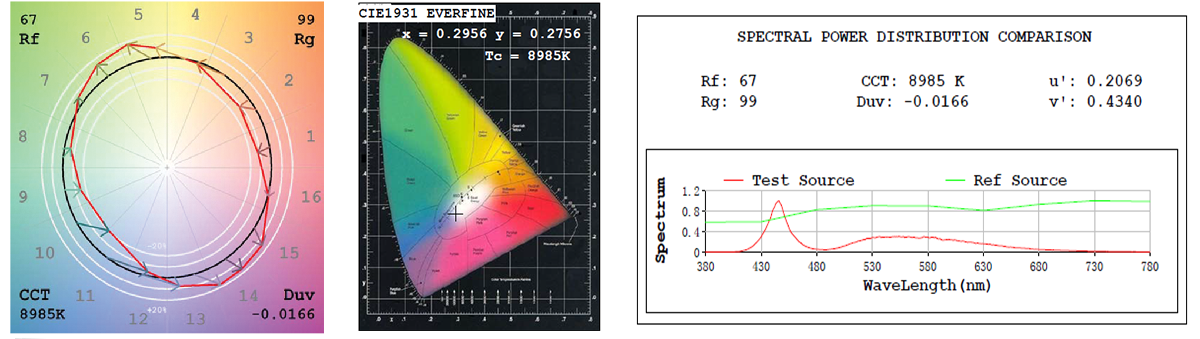 Spectrometry Data | CCT: 8985K | CRI Rf: 67 | Rg: 99 | Duv: -0.0166