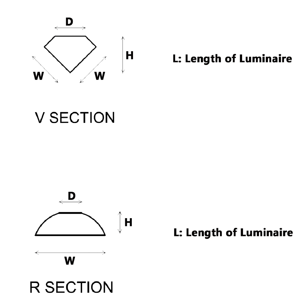 Body & Construction Extruded aluminum sections electrostatically coated after Phospho-Chromatation, offered in two profile shapes: the R-section for flat surfaces and the V-section for corner installations. Polycarbonate diffuser available in clear, milky, or prismatic finish to suit any aesthetic requirement.